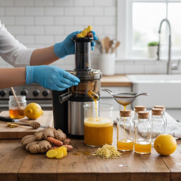 Da Sie bei der eigenen Herstellung auf Konservierungsstoffe und Pasteurisierung verzichten, ist die Hygiene oberstes Gebot für eine sichere Lagerung. Verwenden Sie ausschließlich heiß ausgespülte oder ausgekochte Glasflaschen mit gut schließendem Deckel, um zu verhindern, dass Bakterien oder Schimmelsporen den Saft vorzeitig verderben. Unter sauberen Bedingungen hält sich ein frisch gepresster Ingwer Shot im Kühlschrank etwa fünf bis sieben Tage, wobei der Vitamin-C-Gehalt durch Oxidation täglich leicht abnimmt.