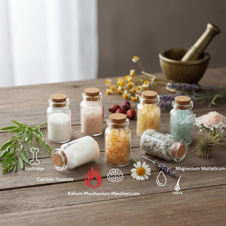 - Haut, Bindegewebe & Stabilität: Nr. 1 (Calcium fluoratum), Nr. 11 (Silicea), Nr. 12 (Calcium sulfuricum).